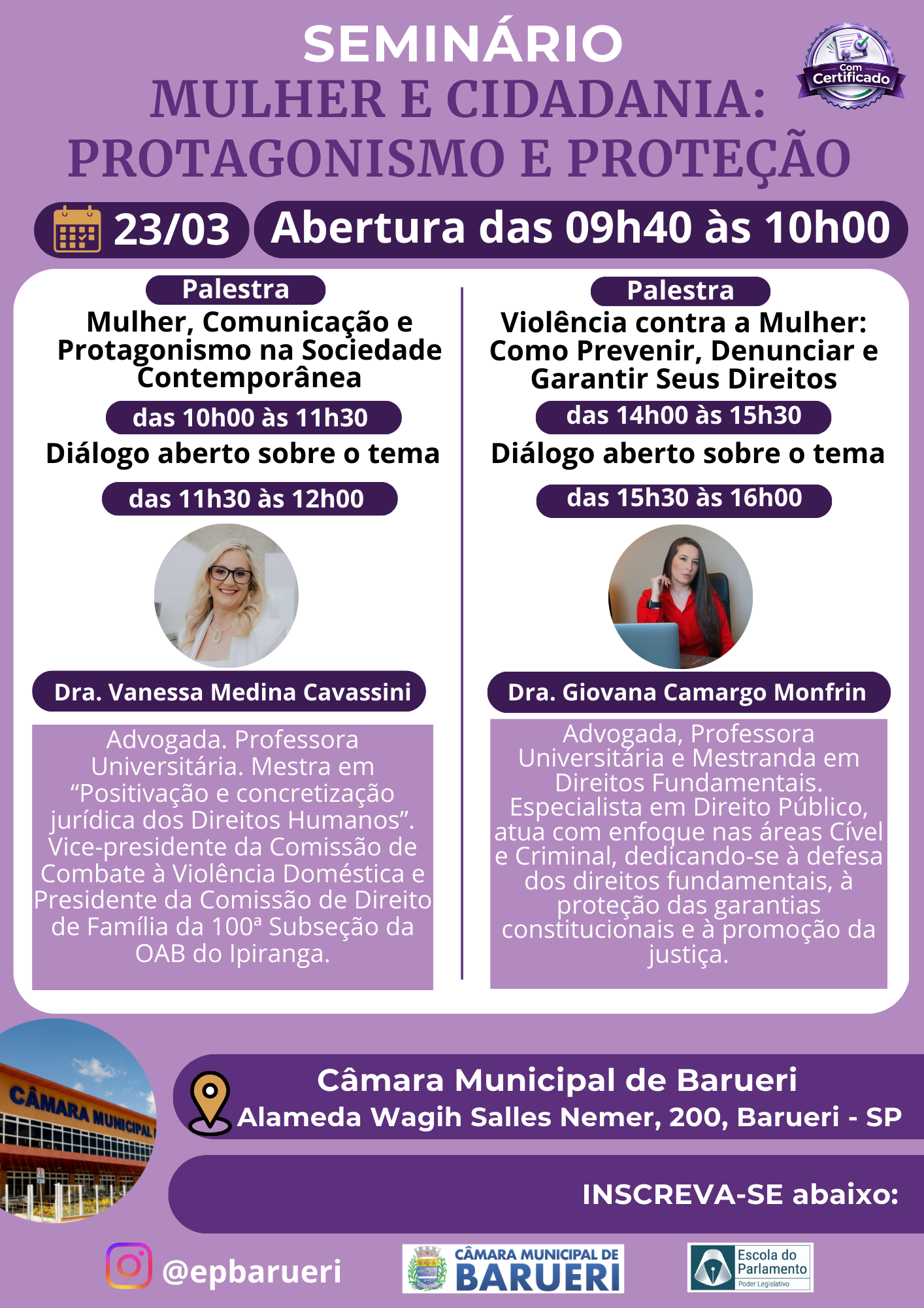 Descrição do Evento: O seminário foi pensado para debater, de forma prática, os desafios e o espaço da mulher hoje. A programação acontece em dois momentos: a manhã será dedicada a entender como a comunicação fortalece a presença e a voz feminina na sociedade. Já a parte da tarde trará um debate fundamental sobre proteção, com orientações jurídicas claras sobre como prevenir a violência, fazer denúncias e garantir direitos.