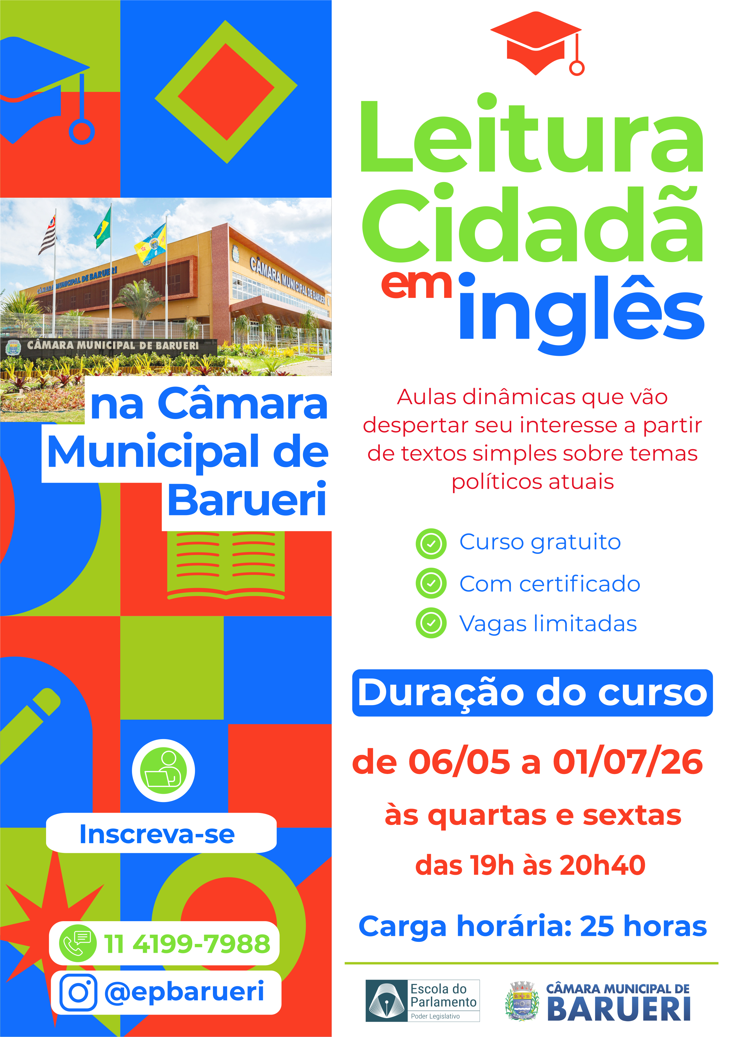 Descrição do curso: O curso tem como objetivo iniciar o contato com a língua inglesa a partir de palavras, expressões e textos simples ligados à cidadania, à política e à atuação parlamentar, despertando o interesse pela leitura e compreensão de temas públicos em uma perspectiva global.
