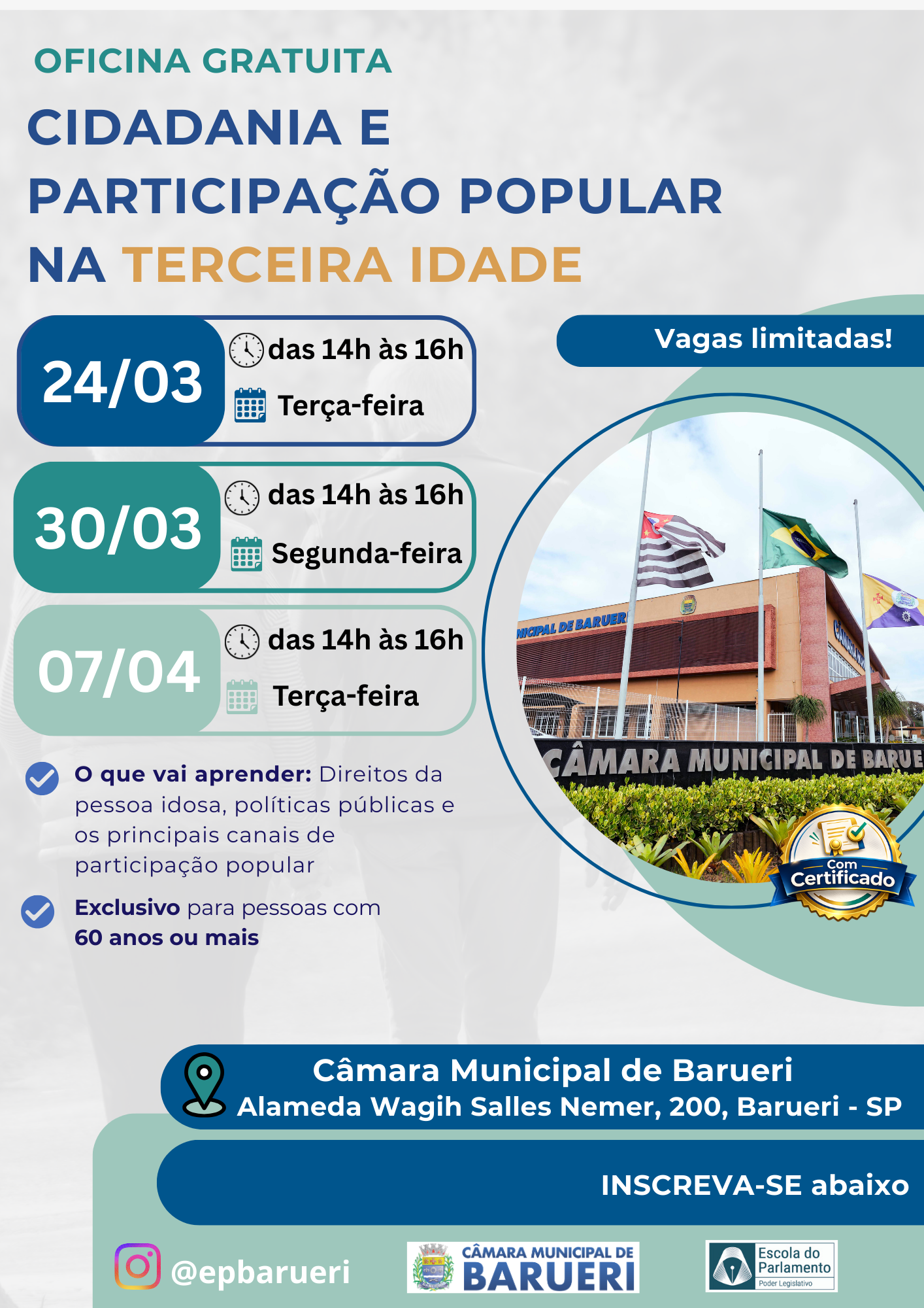 Descrição da oficina: A oficina “Cidadania e Participação Popular na Terceira Idade” é voltada a pessoas com 60 anos ou mais e tem como objetivo fortalecer o protagonismo da pessoa idosa na vida pública do município. De forma acessível e participativa, a atividade aborda direitos da pessoa idosa, políticas públicas e os principais canais de participação popular, como conselhos e audiências públicas. A proposta valoriza a experiência de vida dos participantes e incentiva a atuação ativa na construção de uma cidade mais justa, inclusiva e democrática.